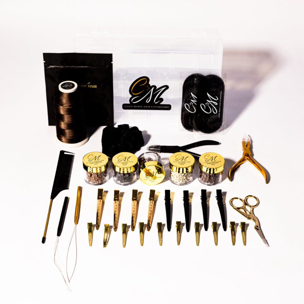 - 5 jars of 5mm COCO MARIE beads in a variety of colors - bead Looper - Pliers used to clamp beads closed and also opens them - COCO MARIE hair grippers - White or Black scrunchie - section comb - Mini scissors - Pouch with 2 needles, 10 mini clips & 4 large clips - Brown nylon thread - COCO MARIE color swatch ring - black COCO MARIE backpack for kit storage - Brush